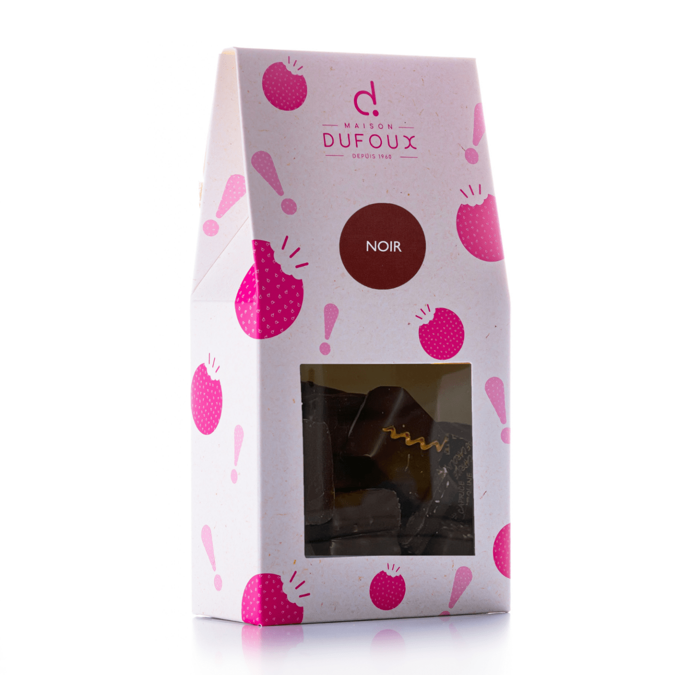 Assortiment de bonbons de chocolat (ganaches et pralinés) enrobés de chocolat noir 70% de cacao, pur beurre de cacao