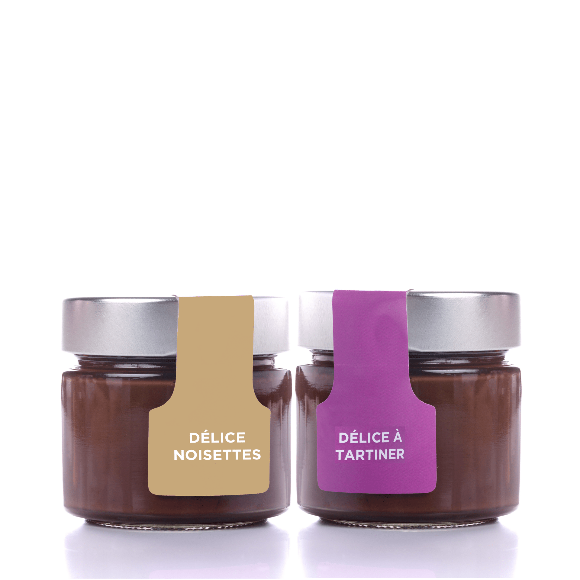 Praliné noisette, gianduja (sucre, noisette (29%), beurre de cacao, lait en poudre, fèves de cacao, émulsifiant : lécithine de tournesol, vanille), huile de pépins de raisin, poudre de cacao.
