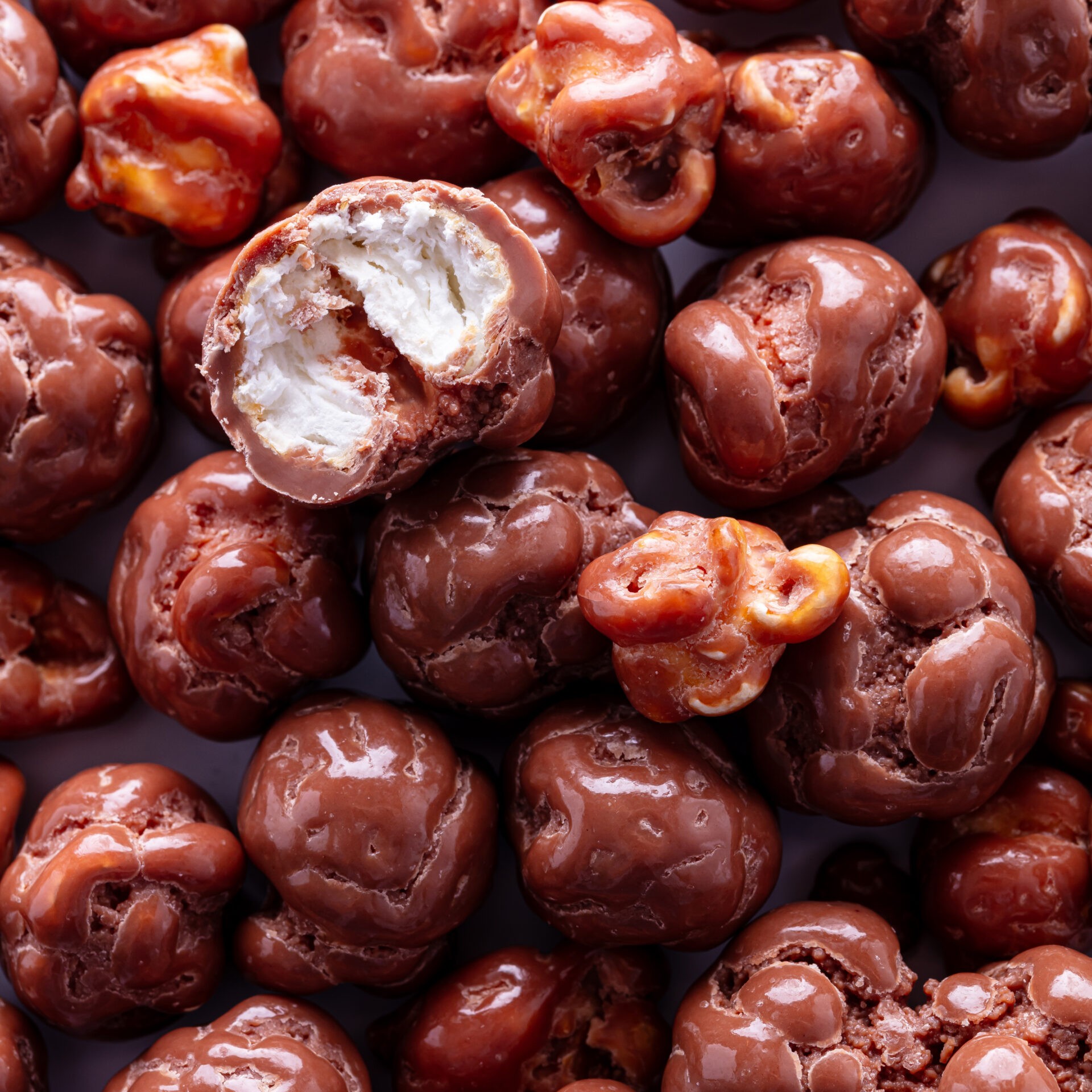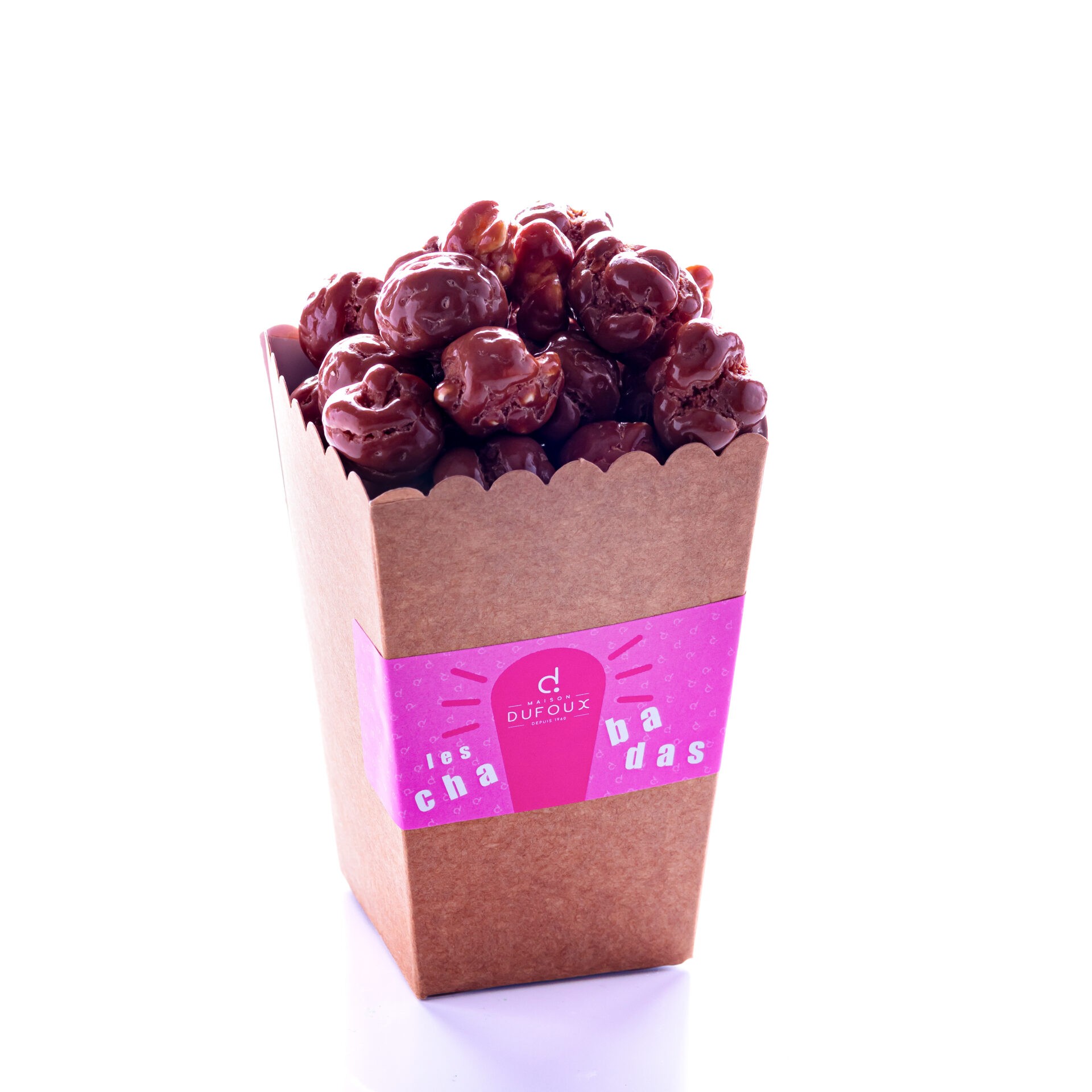 Chocolat lait (sucre, beurre de cacao, lait entier en poudre, fèves de cacao, émulsifiant : lécithine de tournesol, extrait naturel de vanille). Pop-corn caramélisé : caramel 68% (sirop de glucose-fructose, sucre, colorant : caramel E150b), maïs à éclater 25%, huile végétale de tournesol, arôme, sel, émulsifiant : lécithine de tournesol. Sucre, eau, glucose.